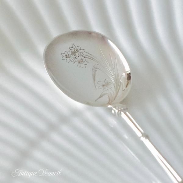 清楚な日本風の花のグラヴュールが銀無垢の美しさを引き立てます。ハンドルは19世紀後半に流行したロシア風のハンドル。アールヌーヴォー初期の時代を反映したデザインです。